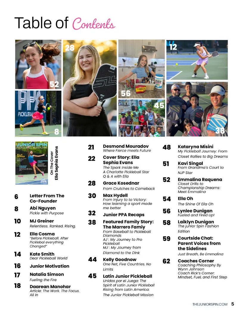 Across the nation, junior tournaments are capturing the energy, discipline, and drive of a new generation, redefining the game one rally at a time. The Junior Spin celebrates these young athletes while connecting schools, community programs, and tournaments to opportunities, resources, and stories that inspire growth both on and off the court. Through our magazine, we aim to showcase talent, build community, and empower the next generation of players to chase their dreams.